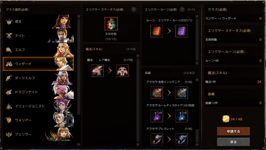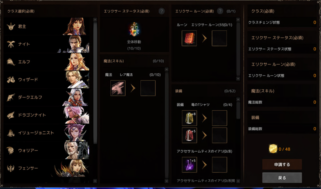 インベントリ内のクラスチェンジコインをダブルクリックすると、クラスチェンジ画面に移動。